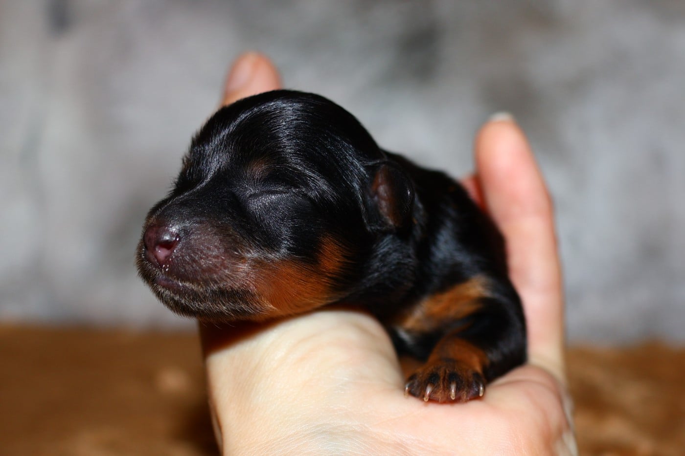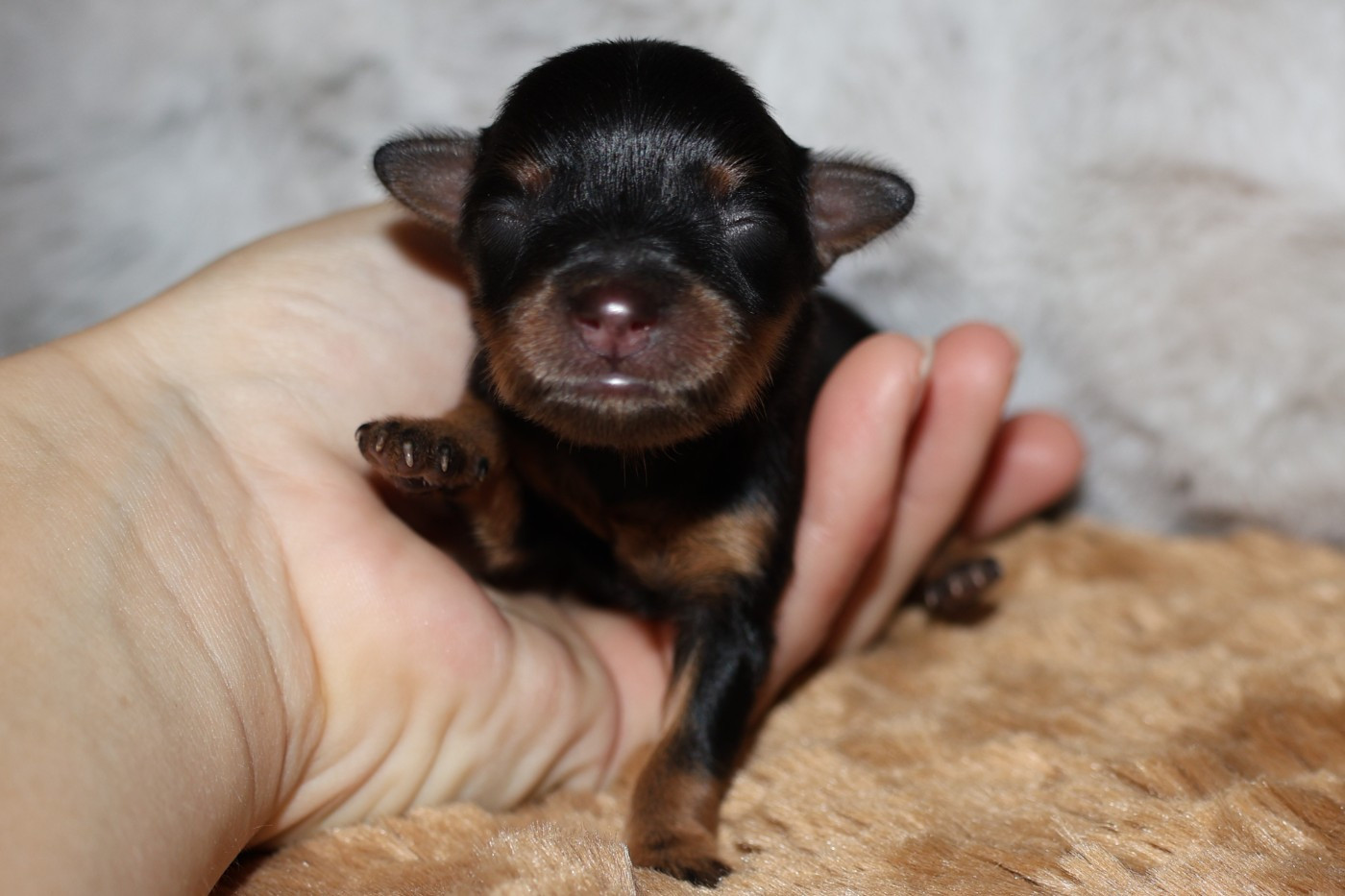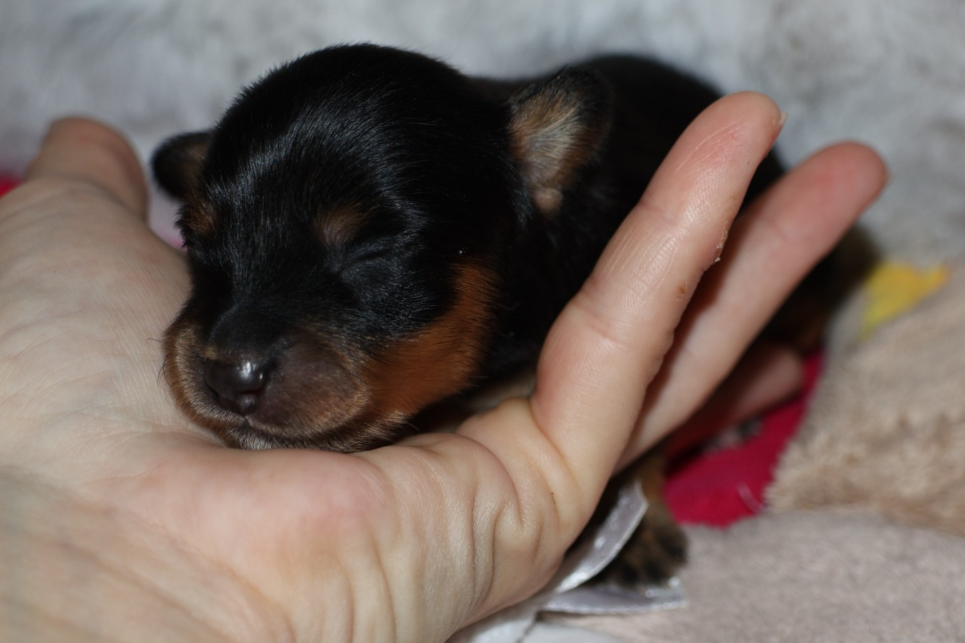 Sublime male noir et feu, avec des feux très bien marqués, sera bien rouge comme sa maman Valky. Excellente pigmentation de la truffe, aura la truffe bien noire. Baltho pèse 189 grammes à la naissance.
